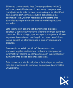 El comunicado del MUAC también advierte que el museo “rechaza la manipulación informativa” y afirma que se llevarán a cabo las acciones legales pertinentes. Además, reitera su compromiso con la protección y cumplimiento de los derechos laborales y señala que atenderá cualquier solicitud realizada conforme a la normativa universitaria.