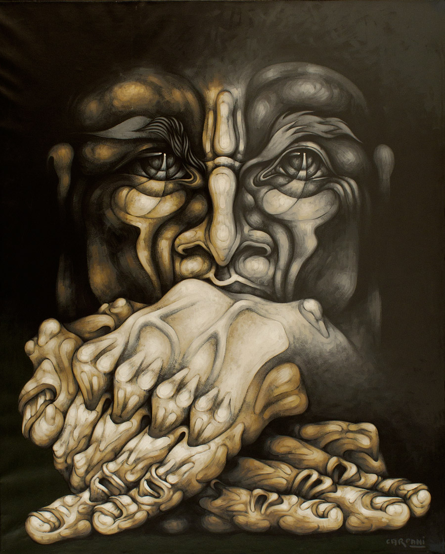 Con Luis Felipe Noé, la fragmentación se vuelve estructura. Sus composiciones caóticas proponen una lectura histórica donde no hay relato lineal posible. La memoria aparece como tejido discontinuo, atravesado por rupturas y superposiciones. Desde la escultura, Juan Carlos Distéfano desplaza el conflicto al espacio tridimensional: cuerpos deformados, tensos, suspendidos que obligan al espectador a experimentar físicamente la violencia.