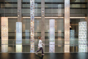 Los desafíos fueron muchos. Aunque desde el comienzo podía imaginar la instalación, el proceso hasta concretarla fue largo. El edificio es monumental y el espacio asignado, sumamente abierto. Predominan el cemento y el vidrio, los pisos negros y una luz natural escasa; el gris y la iluminación tenue definen la atmósfera. Frente a esas características, sentí la necesidad de aportar calidez y liviandad.