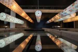 En esta instalación lumínica, la dimensión ambiental e inmersiva aparece justamente en ese diálogo con el entorno. Es una pieza colgante que se mueve con el viento que circula entre los pasillos y cuando se abren las puertas de acceso. Tiene su propia danza sutil: se mece, respira, oscila de un lado a otro. Esa movilidad introduce una dimensión performativa que no depende de una acción explícita, sino de la relación viva entre obra, arquitectura y público.
