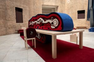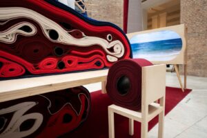 En el Octágono, la instalación se organiza en dos escenas principales que no solo estructuran el espacio, sino que activan una tensión narrativa. En la primera, un cuerpo monumental, construido a partir de tiras de alfombra, reposa sobre una silla y se extiende sobre una mesa de comedor. Frente a él, un televisor reproduce el vaivén de unas olas suaves. La escena es, en apariencia, doméstica. Sin embargo, algo en su escala y en su configuración desestabiliza cualquier lectura cotidiana. Los objetos, mesa, silla, televisión, ya no funcionan como soporte de la vida diaria, sino como elementos desplazados, cargados de una extrañeza latente.