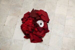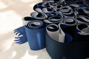 La obra, la más ambiciosa de su trayectoria, se construye a partir de más de 3.500 metros cuadrados de alfombras multicolores, predominantemente rojas y azules, junto a mobiliario doméstico y dispositivos tecnológicos. Este exceso material no es meramente formal: configura una economía visual donde la acumulación deviene lenguaje. En Salgado, la materia nunca es neutra; se presenta como una extensión del cuerpo, como si la superficie textil absorbiera y devolviera una carga afectiva densa, casi somática.