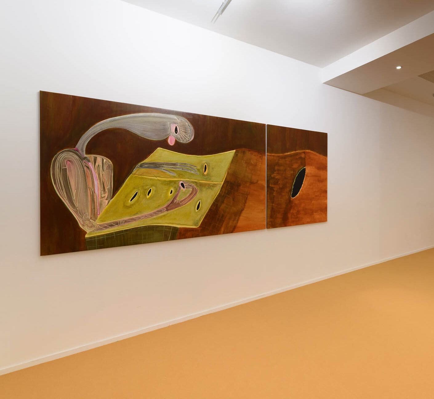 Los movimientos descritos anteriormente encuentran resonancia en los trabajos de Carla Grunauer exhibidos en la galería de Gilda Lavia. Por un lado, en las pinturas, la máscara reaparece como una forma capaz de reunir tradición y contemporaneidad, lo conocido y lo desconocido; los rostros se convierten en superficie de paso entre diferentes dimensiones del ser: el instinto animal y la razón humana. Los trazos fluidos de las pinceladas generan formas cóncavas, aperturas, cavidades que pueden ser a la vez agujero, objeto o superficie, señalando la necesidad de mirar las cosas desde otro punto de vista: el agujero no es vacío, sino momento de tránsito. En las esculturas, la dureza de la estructura esquelética expuesta convive con la fluidez de la resina que la recubre y la contiene. Así, una vez más, vuelve la tensión entre rigidez y fluidez, entre soporte y metamorfosis: sueños sostenidos por esqueletos desmontables, mostrados a la vista, cuyas formas nunca coinciden del todo con las de los huesos humanos “reales”, pero que insisten obstinadamente en remitir a ellos. También aquí se impone una asociación: pinturas rupestres y anatomía moderna se entrelazan en esculturas y pinturas humano-animalescas cuyo significado, como en un test de Rorschach, queda en manos de la mirada del observador.