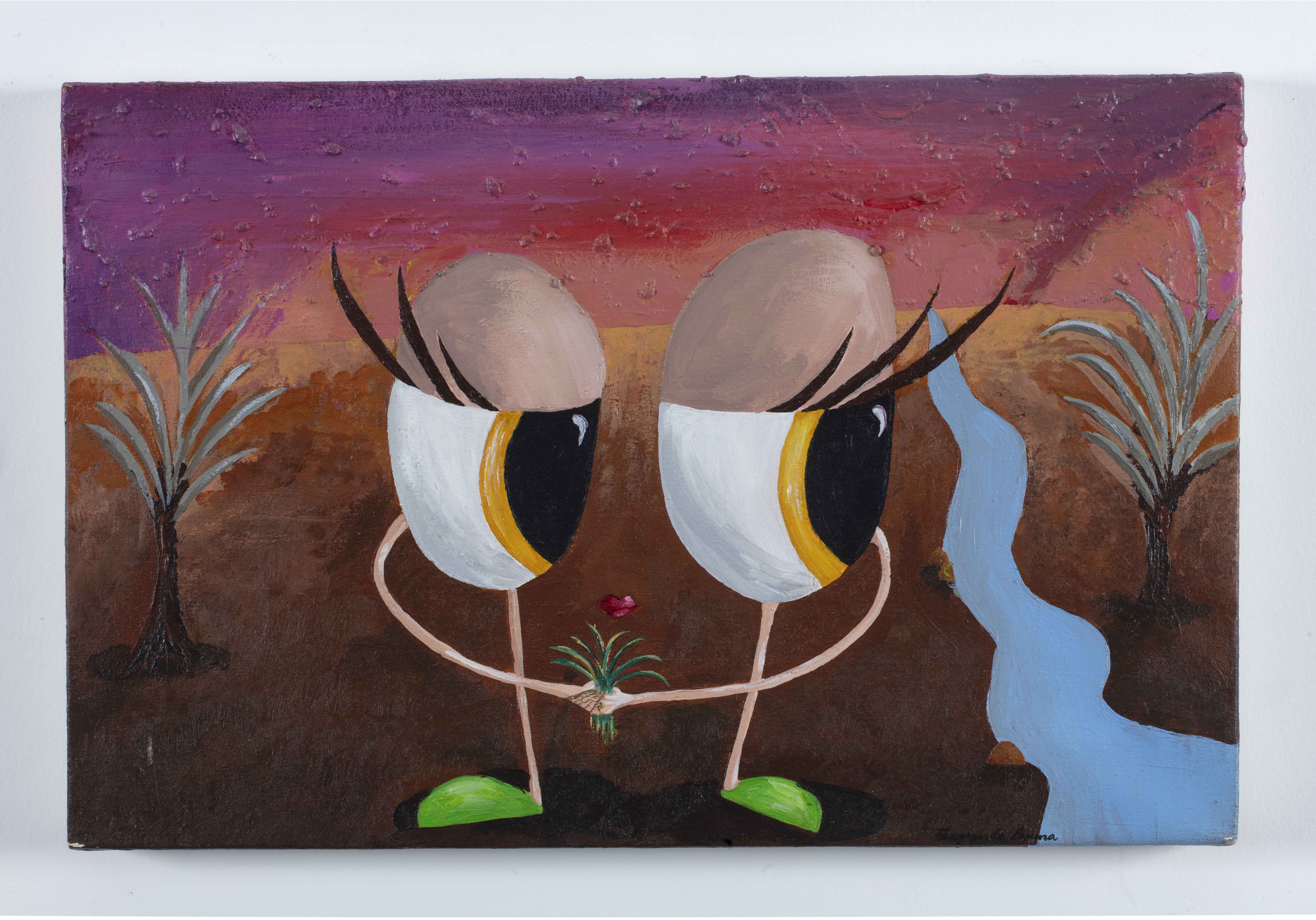 A ese clima se suman, por ejemplo, las inscripciones manuscritas que aparecen en las paredes de la sala, así como las frases poéticas y reflexiones de la artista que acompañan el recorrido y dialogan con las obras expuestas, estableciendo una relación directa entre lenguaje y experiencia artística. Algunas de ellas introducen claves autobiográficas y desdoblamientos identitarios propios de su práctica, como la frase: “Yo soy Fernanda Laguna y también soy Dalia Rosetti y hace unos años soy sangrecita quien hace artesanías”, donde se entrelazan la artista visual, la escritora y sus distintas voces creativas.