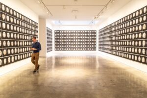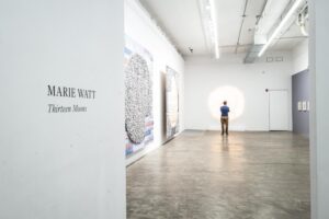 En el centro de la exposición, abierta hasta el 20 de diciembre en Marc Straus, brilla un gran neón dispuesto en círculos concéntricos, donde se leen los nombres de esas trece lunas, como la “Luna del Arce Azucarero” de marzo. El resplandor blanco sobre la pared replica el modo en que la luna refleja la luz del sol.
