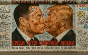 Ese tránsito entre memoria, representación y violencia encuentra una de sus imágenes más incisivas en El beso fraternal / Dios mío, líbrame de este amor tan mortal de Nelson Díaz Brenes. La obra ha tomado como punto de partida el célebre beso entre Brézhnev y Honecker, pero sustituye a los líderes comunistas por Elon Musk y Donald Trump. Al trasladar el meme al lienzo, Díaz Brenes desacelera la circulación digital y convierte la imagen viral en archivo político. Lo que aparece en escena no es una simple ironía, sino una lectura aguda del afecto como tecnología de poder: el amor, la cercanía y la promesa de orden también pueden operar como formas sofisticadas de dominación.
