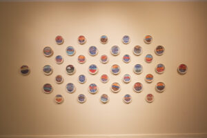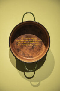 Para esta exposición, Larisa pensó, en un acto de feminismo especulativo, alterar el título de la pintura de Ernesto de la Cárcova Sin pan y sin trabajo, para pensar en un vital “con pan y con trabajo”, haciendo honor y monumento a aquellxs que día tras día llevan adelante trabajos de cuidado. Hacia el final de la sala, sobre una de las paredes, cuelgan platos cuyos fondos están pintados por las integrantes del Comedor Gourmet. En uno de ellos se lee: “soy un ladrillo que hace un castillo” y en otro: “cumbia ritmo espectacular con letras que nos maltratan pero que una villera lleva en las venas”. Las canciones, esos misteriosos platos diversos e infinitos, siempre mutantes, también se sirven, se reciben. Su energía se devora pasando por la boca, los pies, las venas y las mismas manos que luego sazonan el guiso.