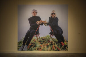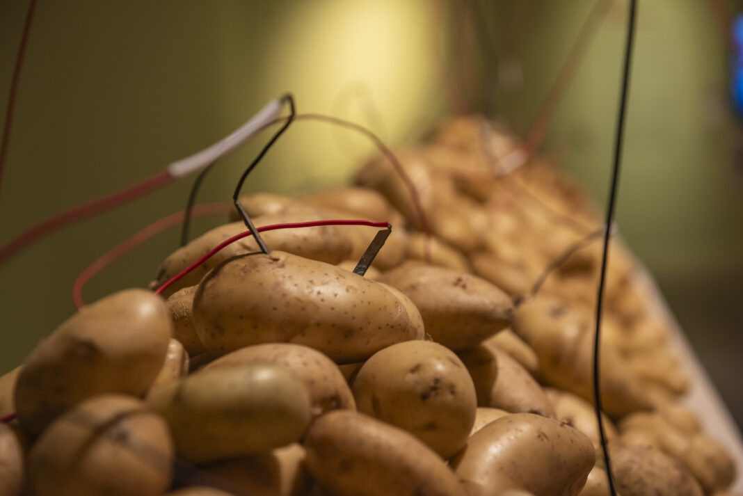 Hay también, entre las obras que la curadora seleccionó para la muestra, algunas que señalan el vínculo entre comida y cuerpo. No solamente en el proceso de metabolismo el cuerpo se hace presente al comer. La comida y los ingredientes, si podemos imaginarlos como cuerpos que no solo son comidos sino que nos comen, actúan de maneras inesperadas. En la obra de Víctor Grippo, las papas en cantidad, correctamente cableadas, son capaces de hacer viajar energía. En la obra de Marta Minujín, el pago de la deuda externa con maíz es una ficción especulativa que pone en escena el valor del maíz como patrimonio, tomando la idea del arte pop de reproducción para restituir su valor de cambio. El maíz podría cancelar la deuda externa si recordáramos la historia de los platos que fueron posibles solo gracias al maíz, la papa, el tomate, el frijol, el chocolate, todos alimentos americanos extraídos e incorporados a la mesa europea luego de la colonización.