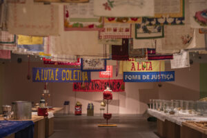 Pensar que la comida también nos come es como hacer un paso de realismo mágico y también una forma de considerar la agencia que tiene la comida en nuestro territorio y en convivencia con la experiencia humana. Y no siempre es un vínculo de maridaje. A veces, el perejil está marchito o no tenemos repasador y tenemos que buscar otra tela que nos permita secarnos las manos para seguir cocinando. La curadora habla del repasador como objeto transicional: ese objeto con el que empezamos y terminamos de cocinar. Entre las mesas largas -como columnas vertebrales o la nave central-, cuelga el Tendal de 100 repasadores, archivo al cuidado del Museo del Puerto de Ingeniero White. Todos los repasadores fueron donados por cocineras, cocineros, docentes y vecinos de Bahía Blanca. Entre ellos vemos: repasadores-calendario, repasadores-mapa, repasadores bordados. El repasador es también un lugar privilegiado para las imágenes de todos los días y es aquello que nos espera secándose cada noche permitiéndonos volverlos a usar.
