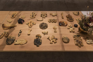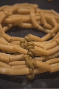 ¿Cuál es el vínculo entre la comida y el arte, siendo este último, una presunta zona para lo original? Una vez más, la relación que tenemos con la comida y los elementos de la cocina es una construcción hecha de un día sobre el otro. Tal vez por eso, las obras que forman parte de la muestra y están hechas de comida, construyen una especie de juego óptico. Hay que acercarse a los collares de fideos de Marcela Sinclair o al rosario de pan de Hoco Huoc, las esculturas de galletitas Traviata de Ignacio Tamborenea o las Wawankunas de Tiziano Cruz para descubrir de qué están hechas. En todas ellas, el vínculo con la comida se transforma. Imaginamos a lxs artistas buscando los ingredientes como quien elige un material, el mejor para esa ilusión, ese ritual. Unidades mínimas de forma y sentido, con las cuales hacer una joya, una cúpula, un funeral, al fin otra forma de comer y de devorar como incorporación vital del alimento, de lo otro.