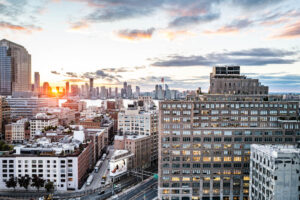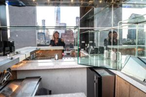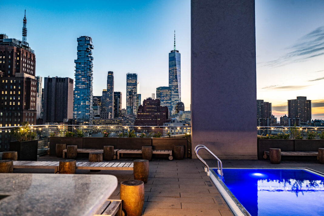 Cada habitación ofrece vistas a través de dos paredes de ventanales de piso a techo, tanto desde el living como desde el dormitorio, sobre SoHo y más allá. Pero el lugar que más nos emocionó fue el bar en la terraza, con el cielo cambiando sobre el skyline de Nueva York. En el último piso se encuentra el bar Jimmy: nada más neoyorquino que mirar el paso de las nubes al atardecer con la brisa otoñal y un trago en la mano.